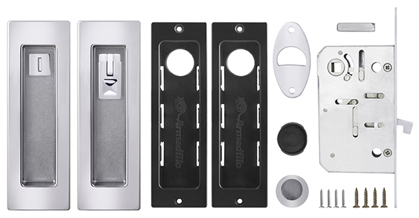 В комплект входит: ручки для раздвижных дверей, пластиковый вкладыш, торцевой захват, защелка для раздвижных дверей, ответная планка, крепежный комплект, шаблон для монтажа. Материал изготовления - цинковый сплав (ZAMAK). Минимальная толщина двери 38 мм.