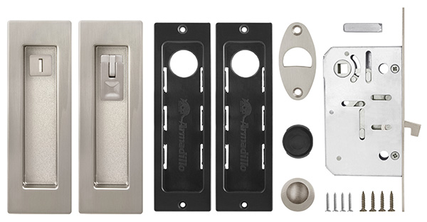 В комплект входит: ручки для раздвижных дверей, пластиковый вкладыш, торцевой захват, защелка для раздвижных дверей, ответная планка, крепежный комплект, шаблон для монтажа. Материал изготовления - цинковый сплав (ZAMAK). Минимальная толщина двери 38 мм.