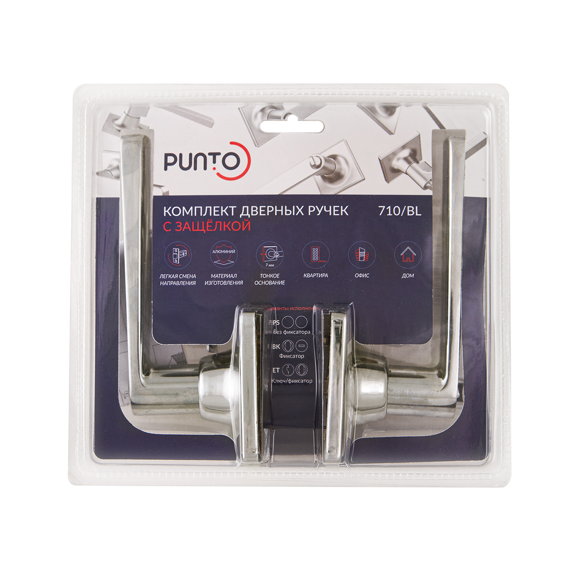 Комплект дверных ручек с защелкой (KNOB) Punto серии 710/BL SN-BK предназначен для установки в межкомнатные двери толщиной 35-45 мм. Толщина основания - 7 мм. Подходит для дверей правого и левого открывания. Гальваническое покрытие прошло тест на устойчивость к коррозии в соляном тумане и соответствует 1 классу ГОСТ. Ресурс работы ручек-защелок более 150 000 циклов открывания/закрывания, что гарантирует безотказную работу двери более чем на 15 лет. Бэксет защелки регулируется - 60/70 мм. Материал изготовления: сталь. Модификация: фиксатор. Цвет: никель. Комплектация: защелка, ответная планка с декоративной заглушкой, дверные ручки, крепежная фурнитура и инструкция по установке.