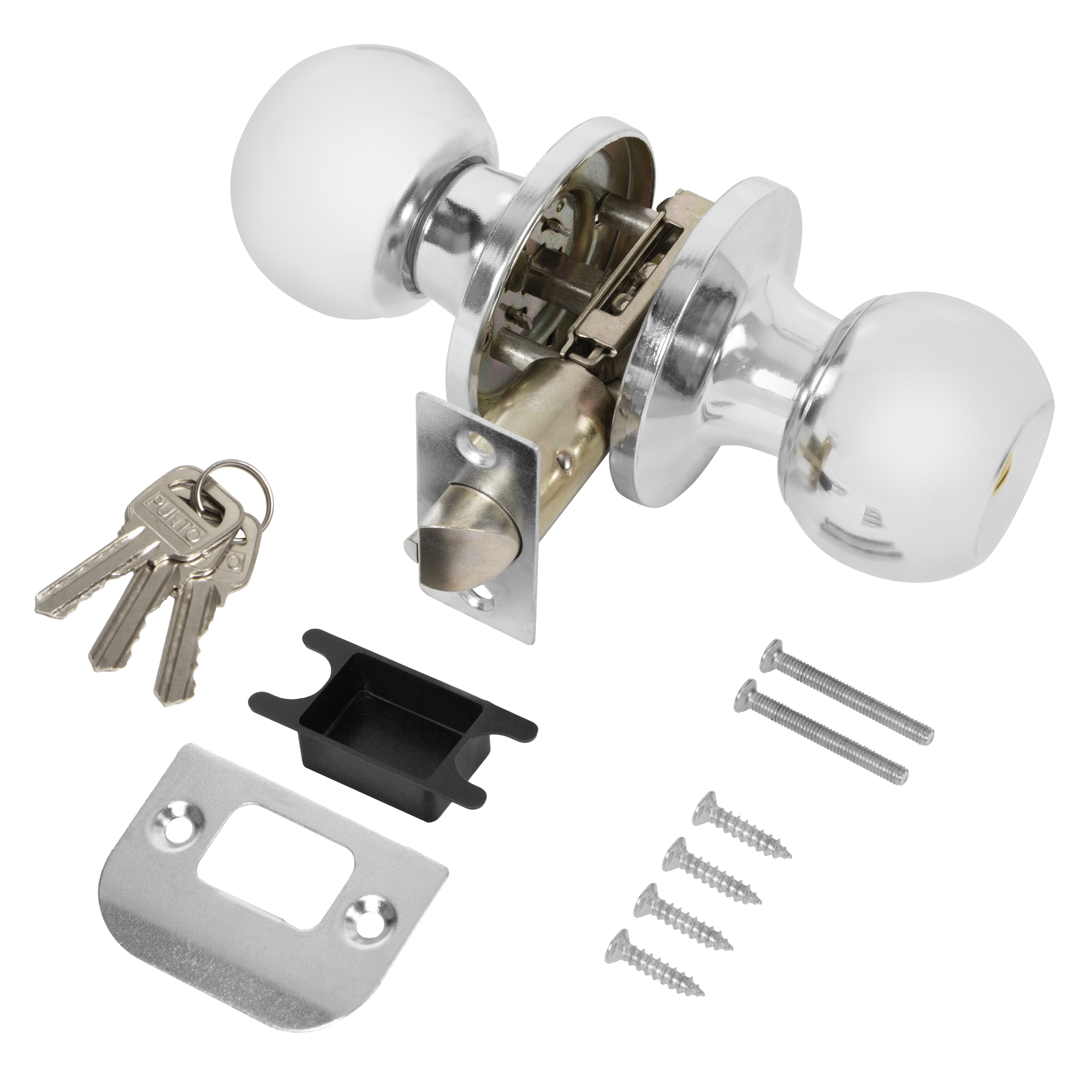 Комплект дверных ручек с защелкой (KNOB) Punto предназначен для установки в межкомнатные двери толщиной 35-45 мм. Подходит для дверей правого и левого открывания. Гальваническое покрытие прошло тест на устойчивость к коррозии в соляном тумане и соответствует 1 классу ГОСТ. Бэксет защелки регулируется - 60/70 мм. Материал изготовления: сталь. Комплектация: защелка, ответная планка с декоративной заглушкой, дверные ручки, крепежная фурнитура, шаблон и инструкция по установке.