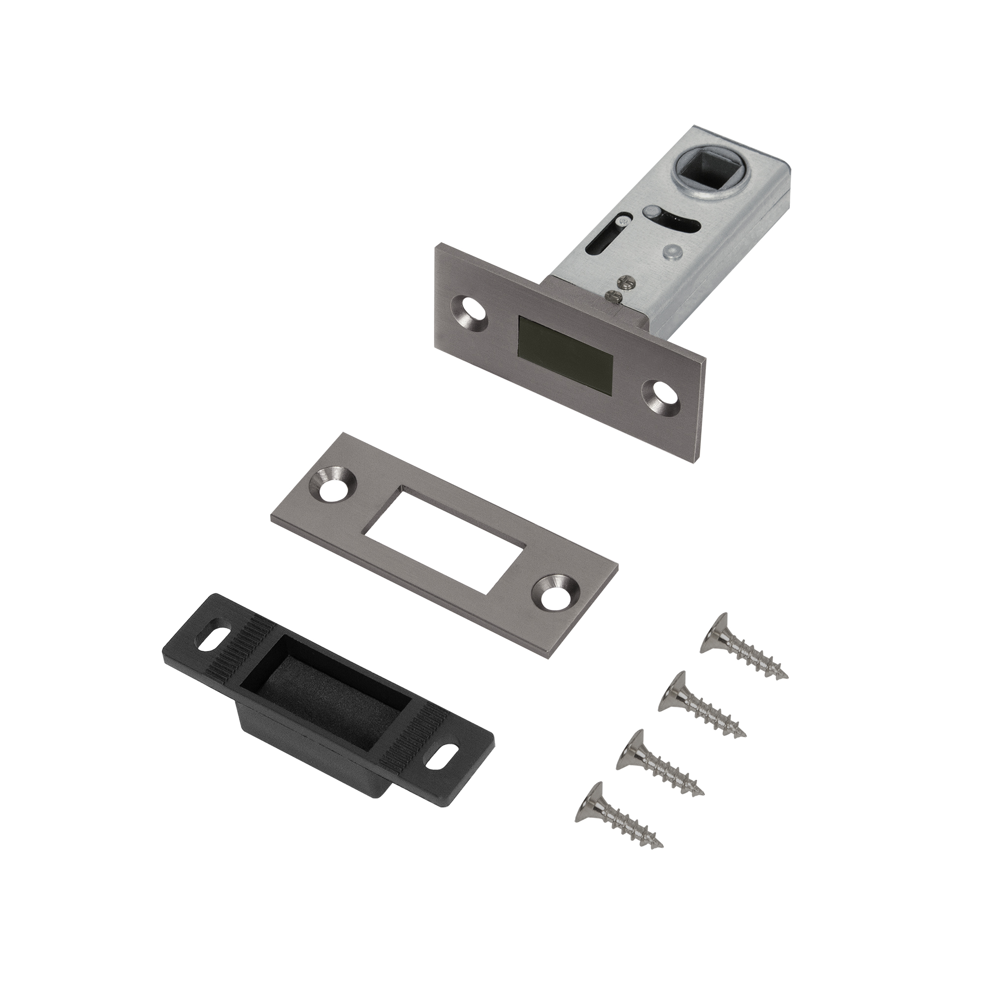 Отверстия под стяжные винты находятся на расстоянии 38 мм. Размер бэксета - 50 мм. Регулируемая ответная планка с магнитной вставкой ±1,5 мм. Возможна установка дверных ручек на стяжные винты для более прочного крепления. Цвет: графит. В комплектацию входят: ответная планка с магнитной вставкой и крепежная фурнитура в цвет изделия.
