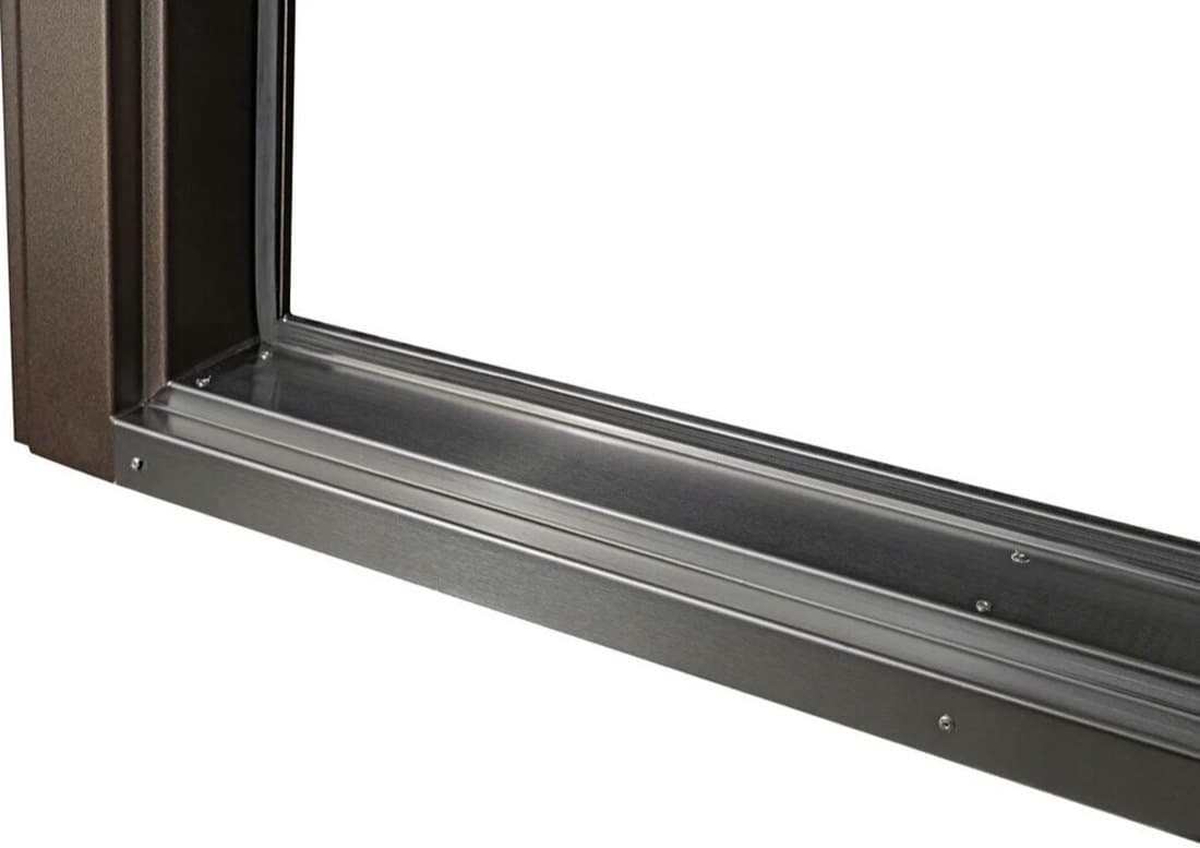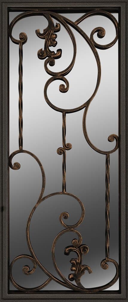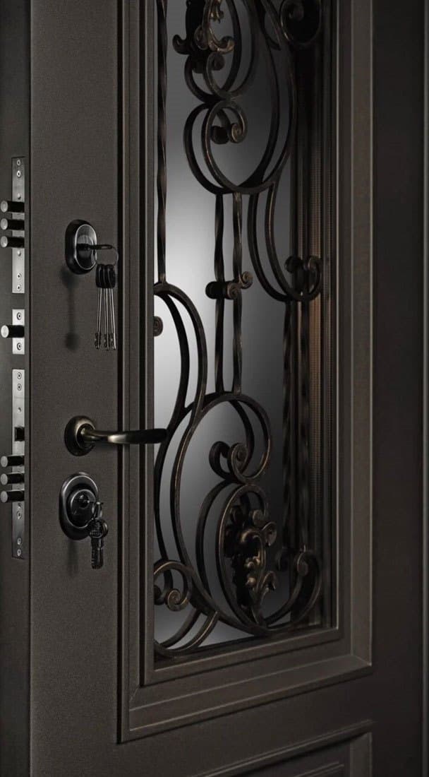 цвет Муар с разноцветными блестками темно-коричневый + цинкогрунтовочный слой, порошково-полимерное покрытие + декорирование металлофиленками + фигурный наличник |