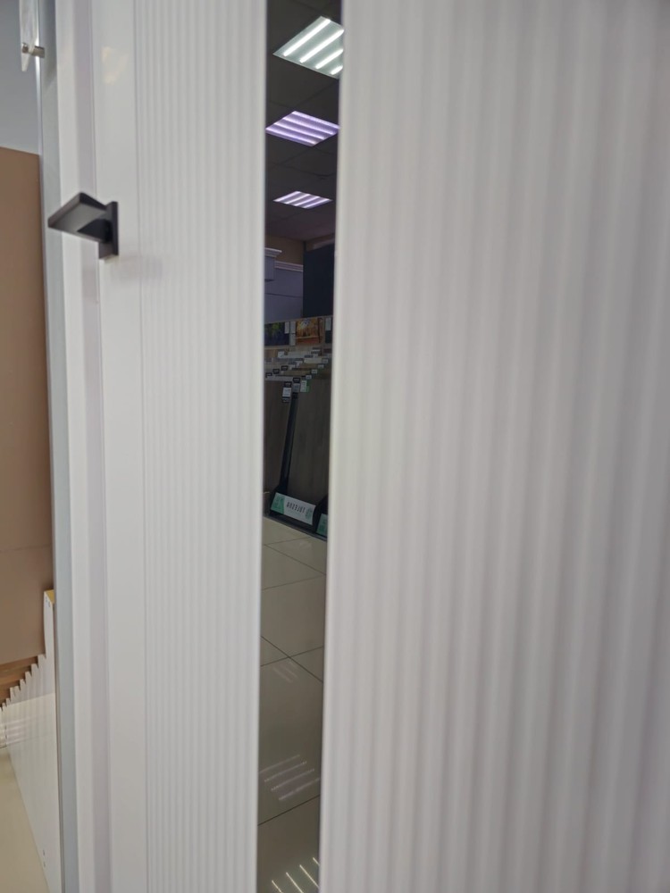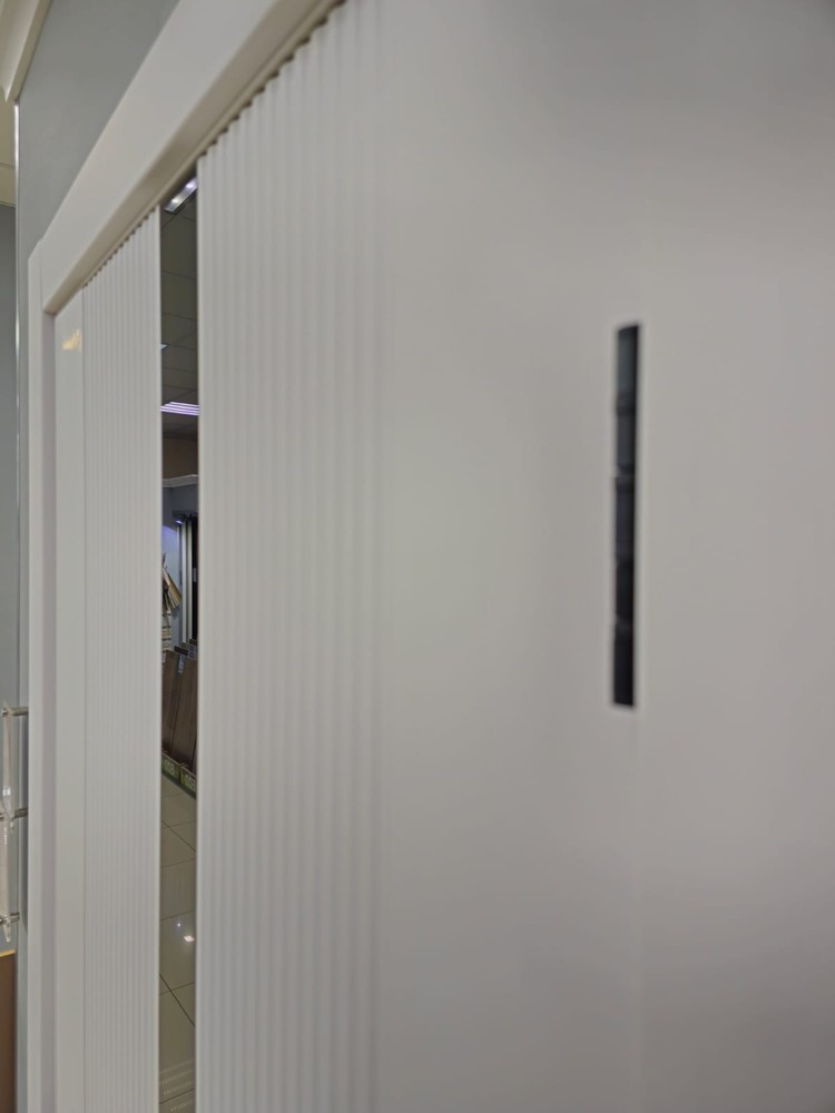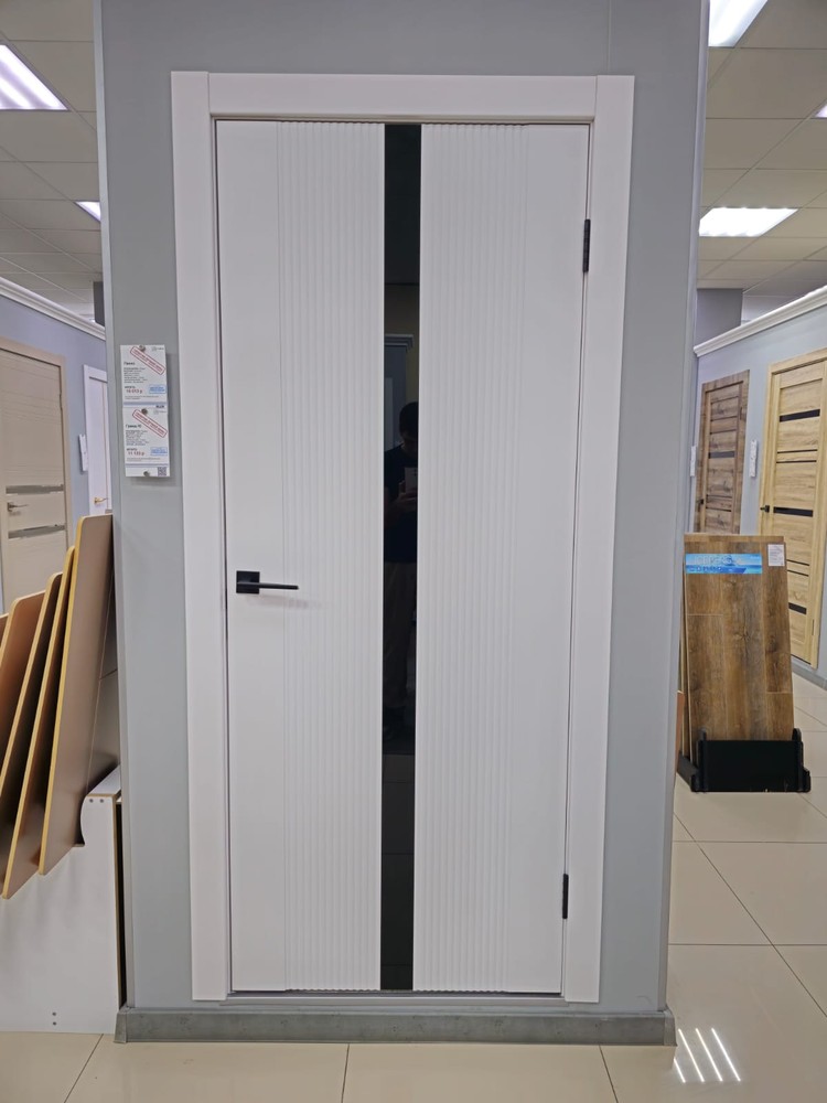 Конструктив:Каркасное (щитовое) полотно, толщиной 36мм. Каркас выполнен из комбинированного материала (МДФ+массив) и обшит МДФ панелями высокой плотности. Для увеличения прочности конструкции применяются горизонтальные ребра жесткости и элементы усиления каркаса.Покрытие: Изюминка данной модели - сочетание белой бархотной пленки, вертикальной фрезировки и вставки черного стекла.